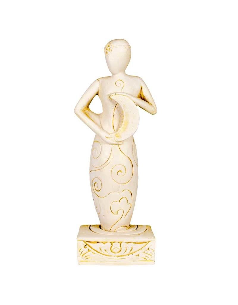 This simple yet elegant Moon Goddess holds a crescent shaped moon in her hands while delicate spirals adorn her body. She has been made with natural gypsum that contains no harmful chemicals. Made in Canada. The Moon Goddess grants our wishes and guides our dreams. She possesses the ultimate creative power and oversees the life, death and rebirth cycle. The Moon Goddess bestows fertility, independence, courage, strength, confidence, intuition and aids one to become fully developed. She is the symbol of female power and clarity.